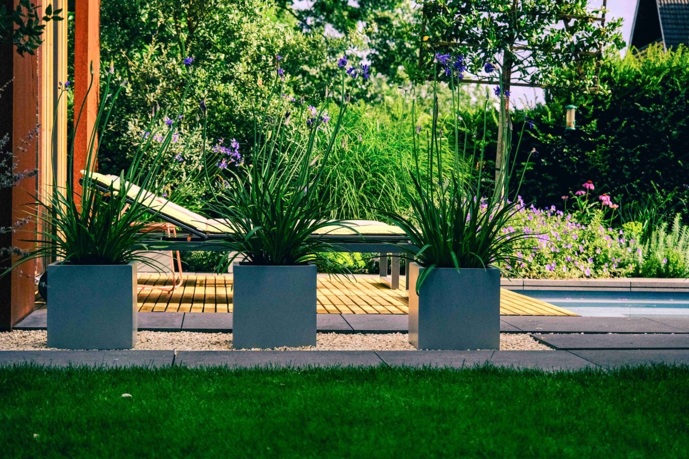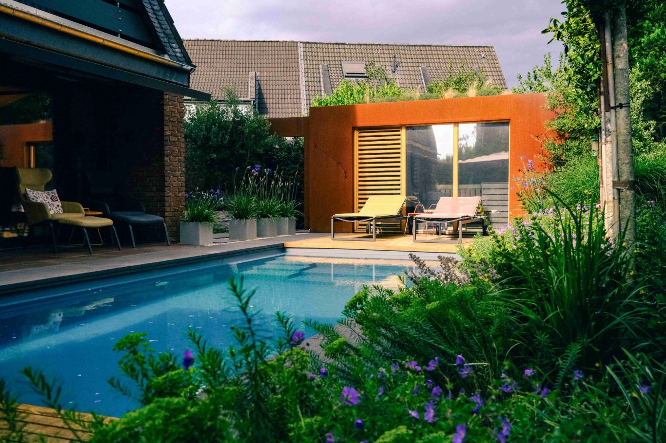 Gartencharakter Der Garten versprüht einen besonderen Charme. Aufgrund des Zusammenspiels der Materialien wie Naturstein, Cortenstahl, Holz und Wasser in Kombination mit einer weichen Staudenbepflanzung wirkt alles sehr harmonisch. Die geraden Kanten von Stein und Stahl werden durch die reich strukturierten Pflanzstreifen entlang der umlaufenden Pooleinfassung zum Teil gebrochen, beleben dadurch die Ränder und erzeugen spannende Kontraste. Die warmen Farben der verwendeten Materialien erzeugen im Zusammenspiel mit der reflektierenden Wasseroberfläche des zentralen Pools spannende optische Effekte und erzeugen einen mediterranen Charakter. Der eingangs erwähnte Mangel an räumlicher Kohärenz und schwach ausgebildetere Einzelgefüge, konnte durch die Umgestaltung behoben werden. Einzelne Gartenräume und das sich daraus zusammensetzende Gesamtgefüge wirken nach der Umgestaltung komplett. Ein lauschiger Frühstücksplatz unter Weinreben in der Morgensonne lädt zu einer Tasse Kaffee ein, Entspannung in der Sauna nach einem Arbeitstag, zwei große Liegen am Wasser, um sich zu sonnen und eine üppige Terrasse mit großem drehbarem oval förmigem Esstisch für Familie und Freunde am Pool, der einige Monate im Jahr zum Schwimmen einlädt.