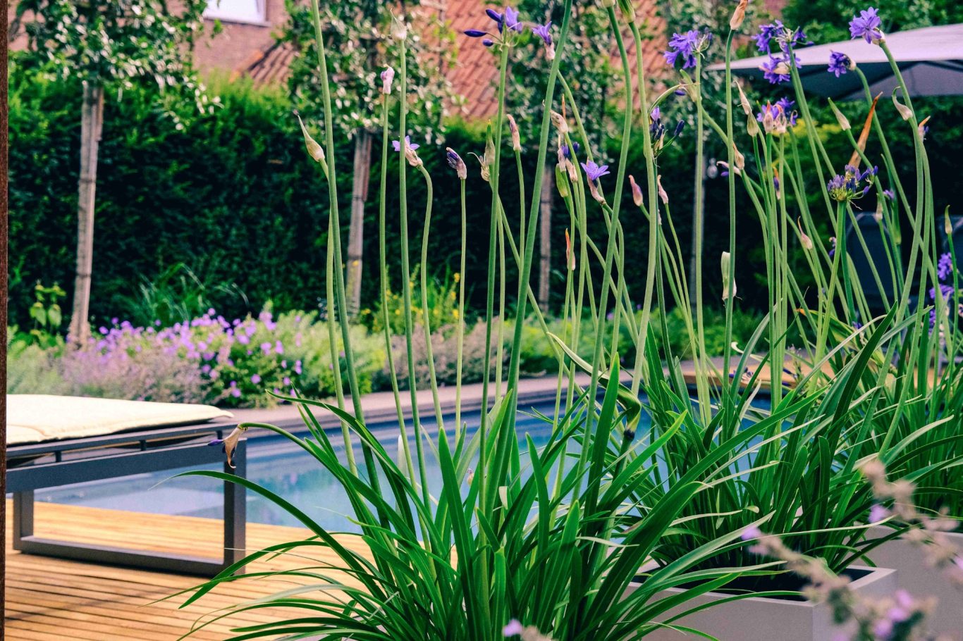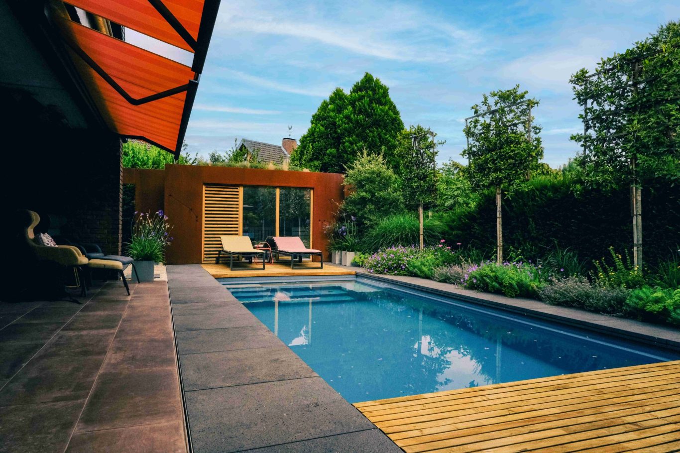 Ziel der Planung war es, verschiedene Gartenbereiche gestalterisch miteinander zu verbinden, Bezüge herzustellen und Kontraste zu schaffen, wie z.B. durch den im Bereich der Sauna verwendeten Cortenstahl mit dem Klinker des Wohnhauses, den hellbraunen keilverzinkten Robinienholz-Dielen der beiden Terrassen und den Holzverbelendungen der Sauna, dem dunklen Grau der Basaltplatten und dem bei Sonneneinstrahlung azurblau schimmernden Wasser des Polls sowie den unterschiedlich stark gedeckten Grüntönen und Strukturen der fassenden Pflanzung.